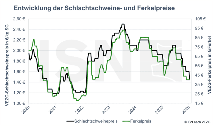 Am heutigen Mittwoch gab die VEZG-Notierung für Schlachtschweine um 15 Cent auf 1,45 €/kg SG nach. Die ungünstige Lage der Feiertage am Jahreswechsel 2025/26 führte in den beiden vergangenen Wochen zu ausgefallenen Schlachttagen. Dadurch verzögerte sich die Vermarktung schlachtreifer Tiere und es entstand ein Überhang am Lebendmarkt. Der Abbau der Überhänge dürfte nach heutiger Einschätzung jedoch deutlich schneller verlaufen als zu Beginn des Jahres 2025. Anders als zum vorigen Jahreswechsel konnten die Schlachtungen in den Wochen vor Weihnachten diesmal spürbar ausgeweitet werden. Schweine wurden vorgezogen und die Schlachtgewichte gingen in den letzten Wochen vor den Feiertagen stärker zurück als üblich. Insgesamt lagen die Schlachtgewichte leicht unter dem Vorjahresniveau. Zudem hatten viele Mäster die Erfahrungen vom vergangenen Jahreswechsel im Blick und weniger Ferkel eingestallt, die rund um die Feiertage schlachtreif geworden sind bzw. werden. Die Ferkelimporte aus den Niederlanden lagen im Herbst 2025 deutlich unter dem Vorjahresniveau. Außerdem werden aktuell weniger Schlachtschweine aus den Niederlanden und Belgien zur Schlachtung nach Deutschland importiert als noch vor einem Jahr.