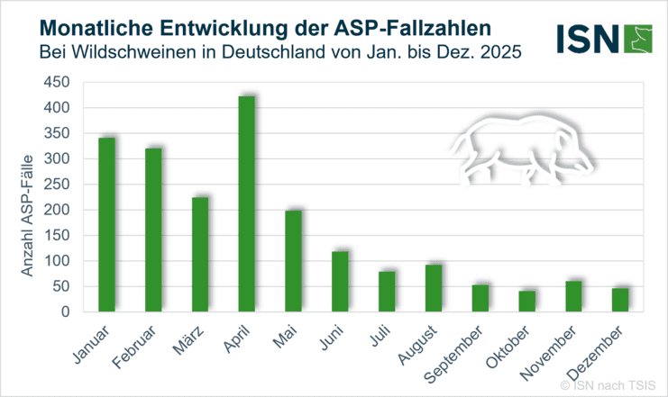 Die monatliche Entwicklung der ASP-Fallzahlen zeigt ab Mitte des Jahres einen deutlichen Rückgang (© ISN nach TSIS)