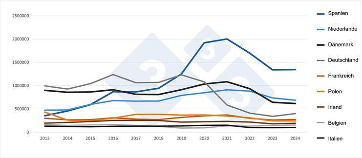 Die Niederlande positionierten sich 2024 mit 686.000 exportierten Tonnen an zweiter Stelle, deutlich vor Deutschland und Dänemark.