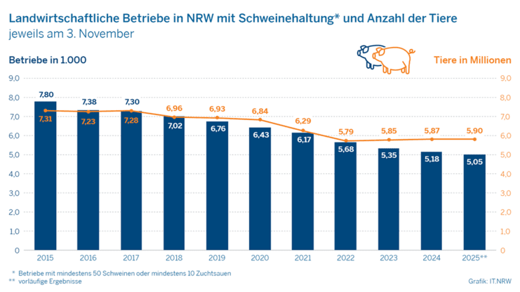 In Nordrhein‑Westfalen hielten am Stichtag 5.050 Betriebe Schweine, was einem Rückgang von 2,5 % gegenüber dem Vorjahr entspricht. Insgesamt wurden rund 5,90 Millionen Schweine registriert, ein leichtes Plus von 0,5 %. Besonders stark wuchsen die Bestände bei Jungschweinen (+ 24,7 %) und Ferkeln (+ 4,2 %), während die Zahl der Mastschweine über 50 kg um 10,4 % sank. Die Zahl der Sauen stieg leicht auf 336.300 Tiere (+ 2,6 %).
