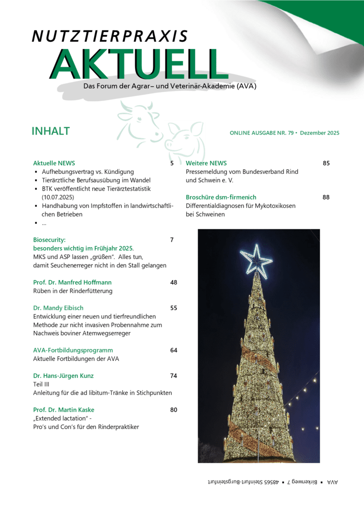 Die aktuelle "Weihnachtsausgabe 2025" (Nr.79, Dezember 2025) der NUTZTIERPRAXIS AKTUELL (NPA), aus der Schriftenreihe der Agrar- und Veterinär-Akademie (AVA), steht ab sofort zum Downloaden zur Verfügung.