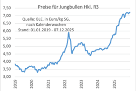 Die Preise für Bullen übertreffen kurz vor dem Jahresende die letzten Höchststände von Ende September 2025. Bei Kühen steigen die Preise aktuell ebenfalls wieder an, obwohl die letzten Rekordpreise von Ende September nicht erreicht werden. Wie zu erwarten, kommt die Preisrally bei Rindfleisch aber kurz vor dem Jahreswechsel zum Stillstand. Zudem hatte sich der Preisanstieg mit dem Beginn des Weihnachtsgeschäfts noch einmal beschleunigt. Dabei sind die Bullenpreise im Jahresverlauf 2025 um fast 1,50 Euro je kg SG gestiegen, auf ein Niveau, das es zuvor noch nicht gegeben hat… .