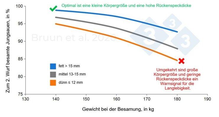 Es gibt zahlreiche Belege dafür, dass das Gewicht und die Rückenspeckdicke von Jungsauen bei der Erstbelegung in engem Zusammenhang mit ihrer Produktivität und Langlebigkeit stehen.